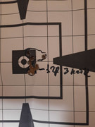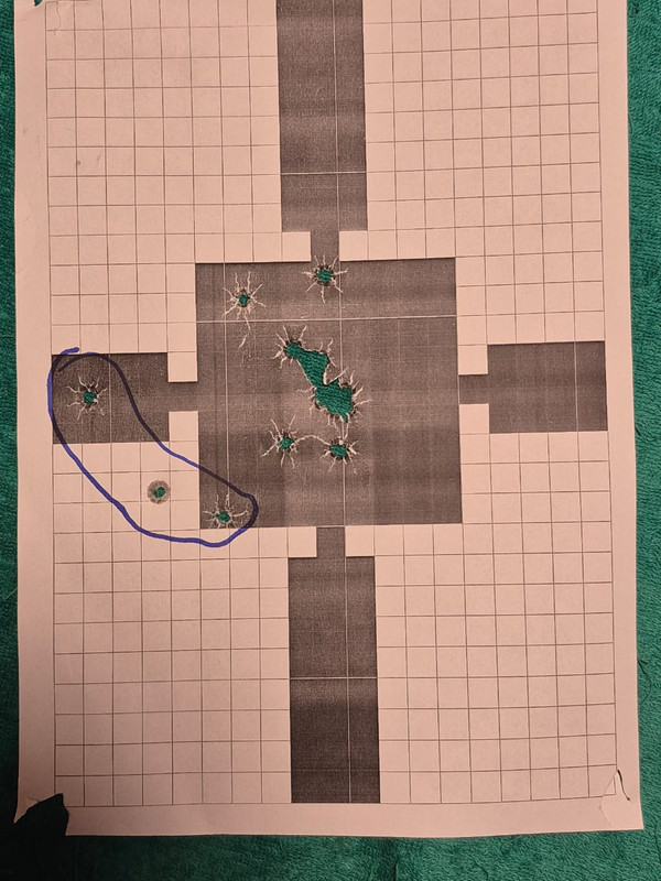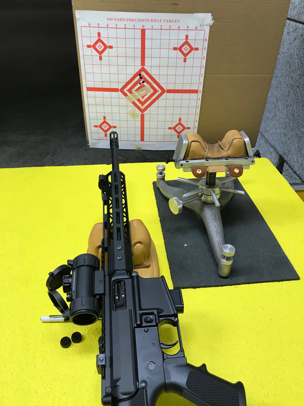 Первые выстрелы. На мишени две групы, первая 12 пуль в черном квадрате 9 на 9 см Вторая 3 пули, попытка попасть в чёрную полосу слева от центра дистанция около 30 м [IMG] [/IMG]